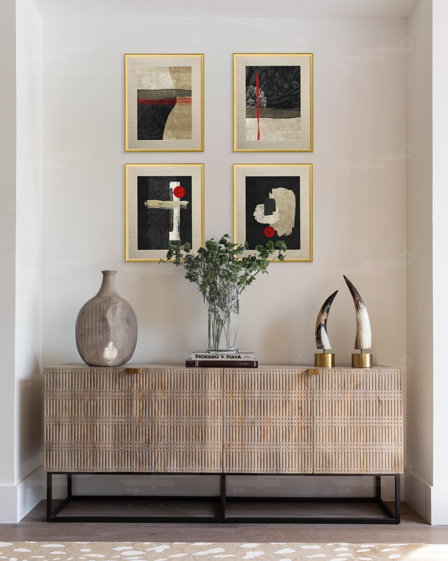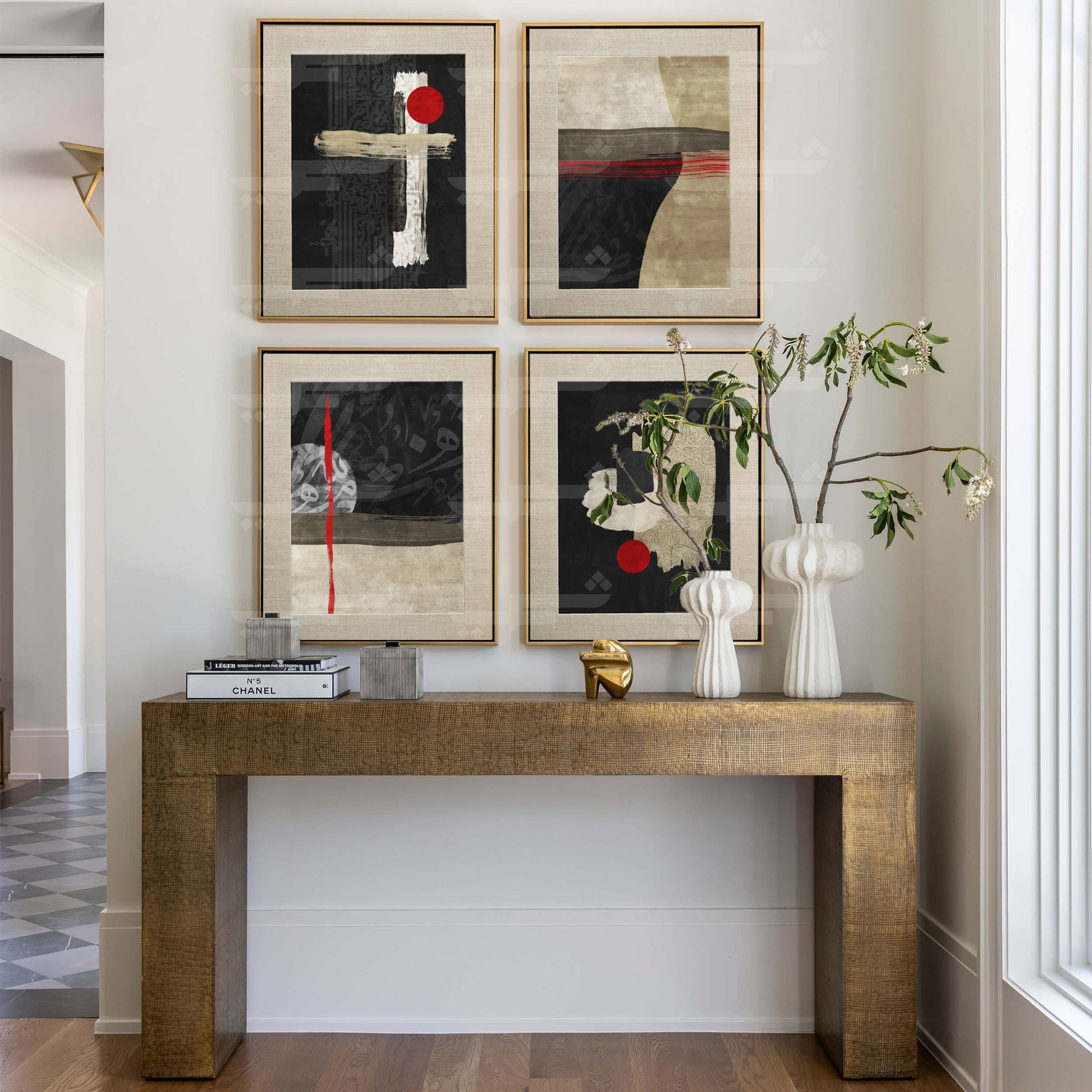 مجموعة من ٤ لوحات بإطار ذهبي مطبوعة بتصاميم مختلفة بطابع عربي حديث بالاضافة لخام اللنن