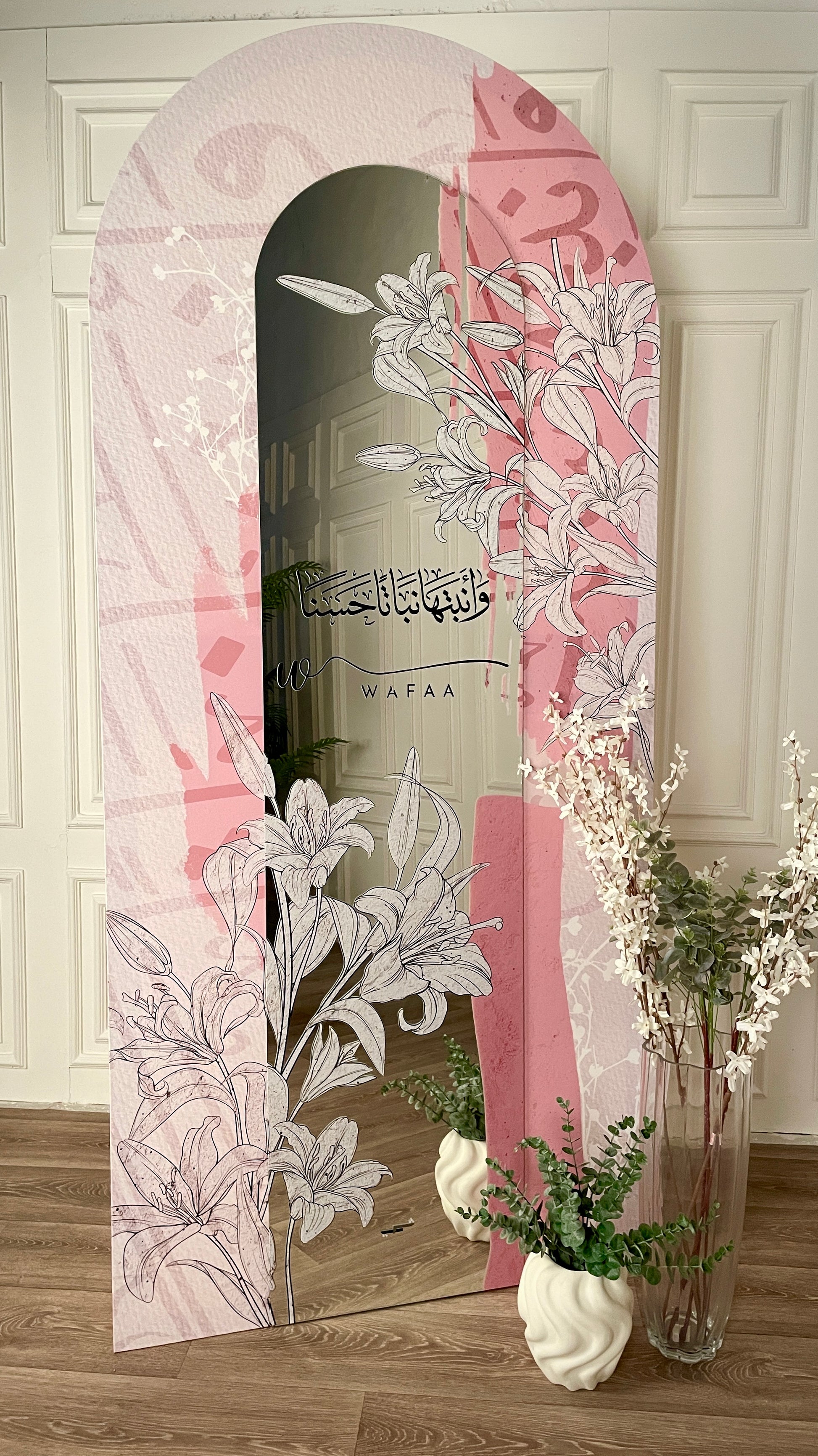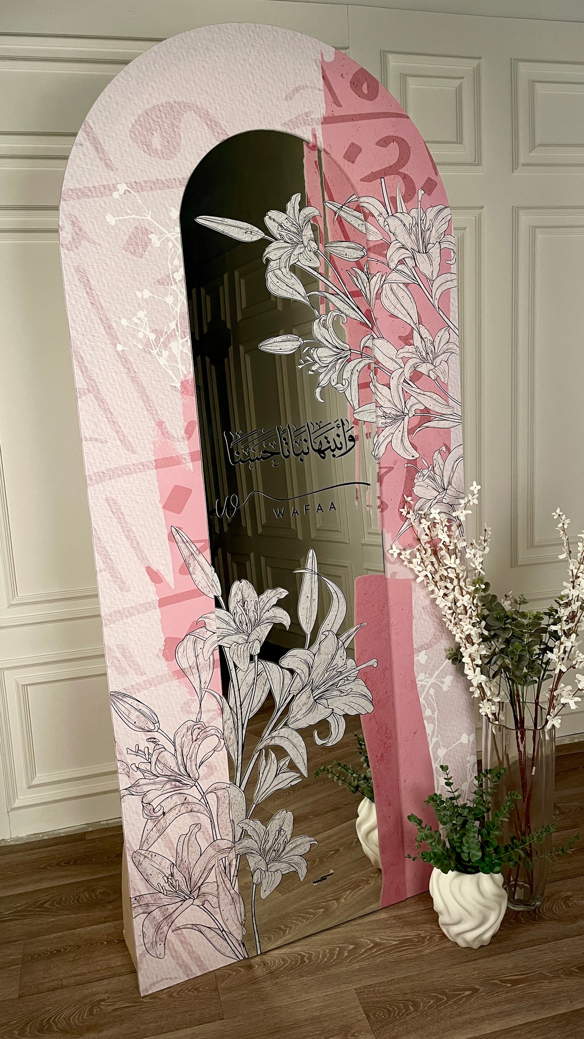لوحة مرايا بقوس دائري بطباعة باللون الوردي والابيض