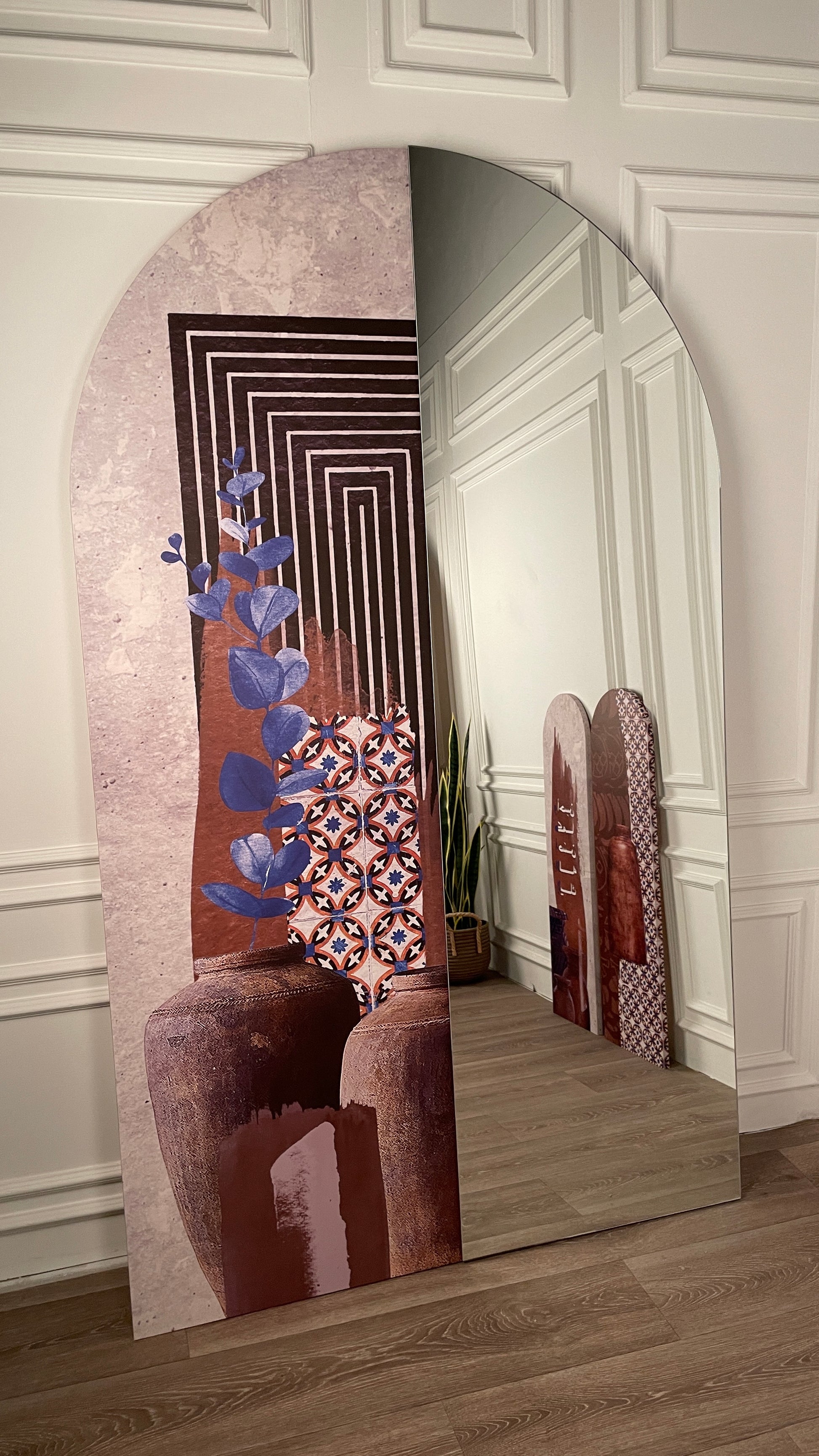 لوحة مرايا بقوس دائري بطباعة باللون البني والازرق والابيض