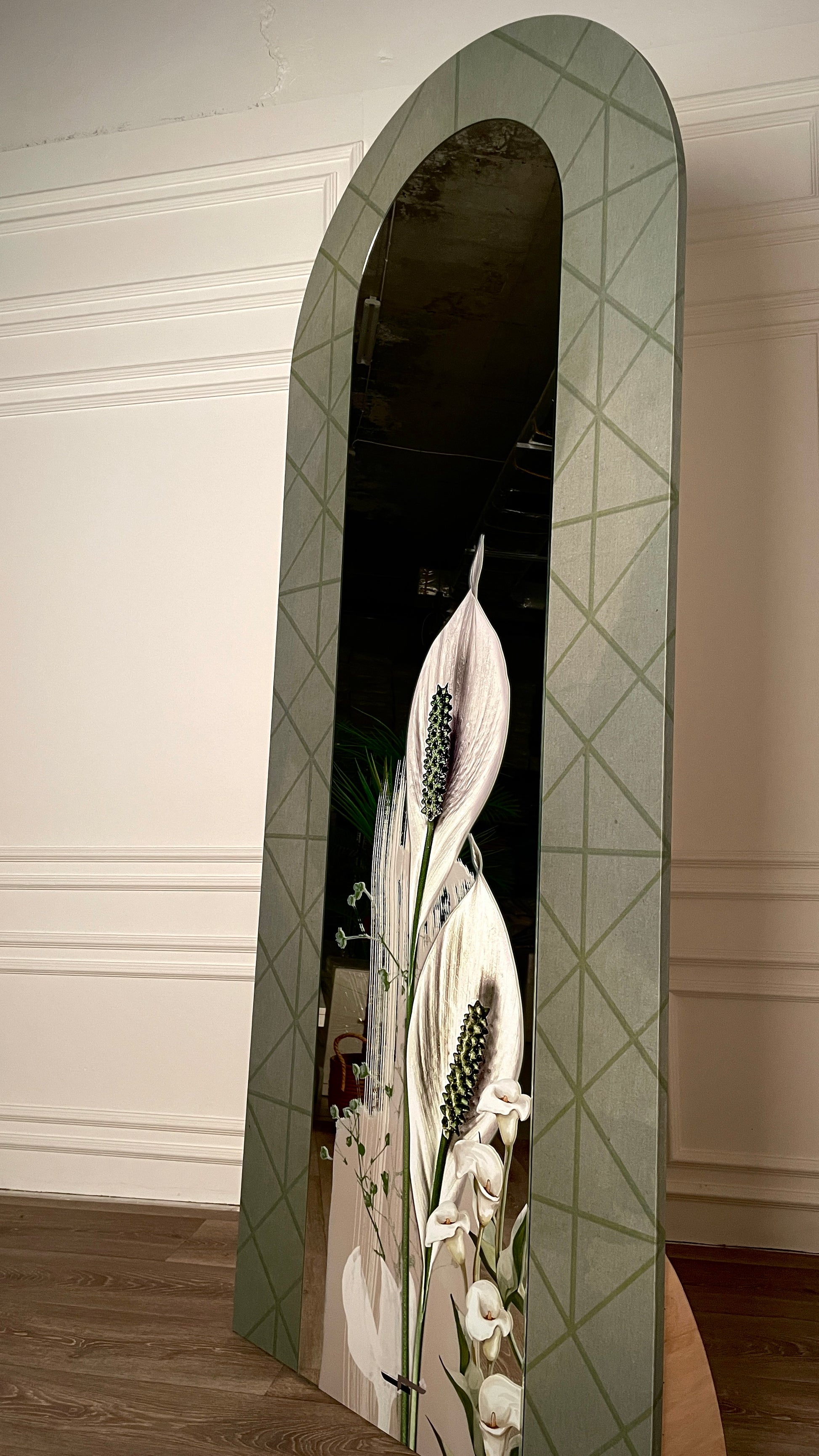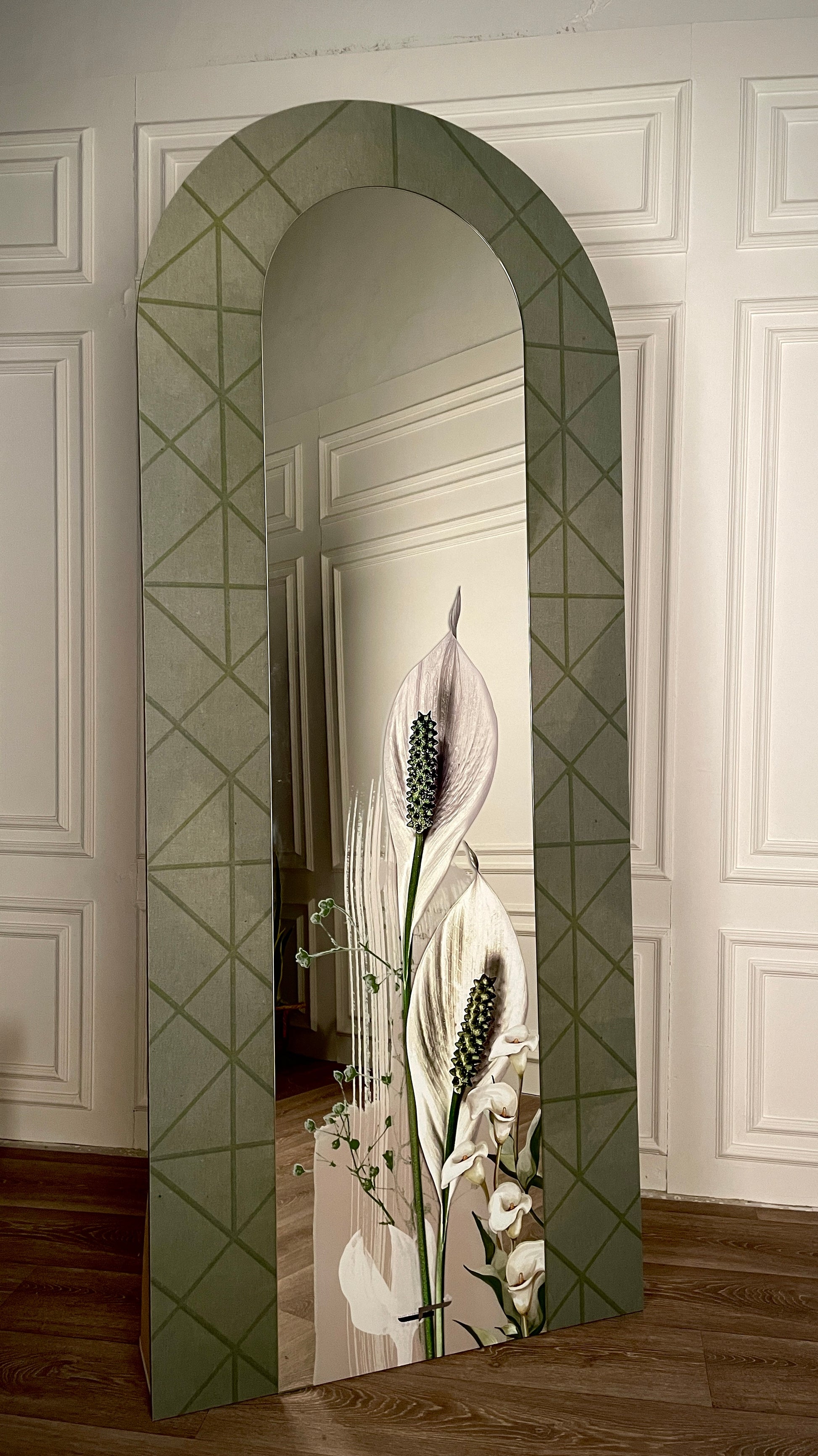لوحة مرايا بقوس دائري بطباعة باللون الاخضر الزيتي والابيض